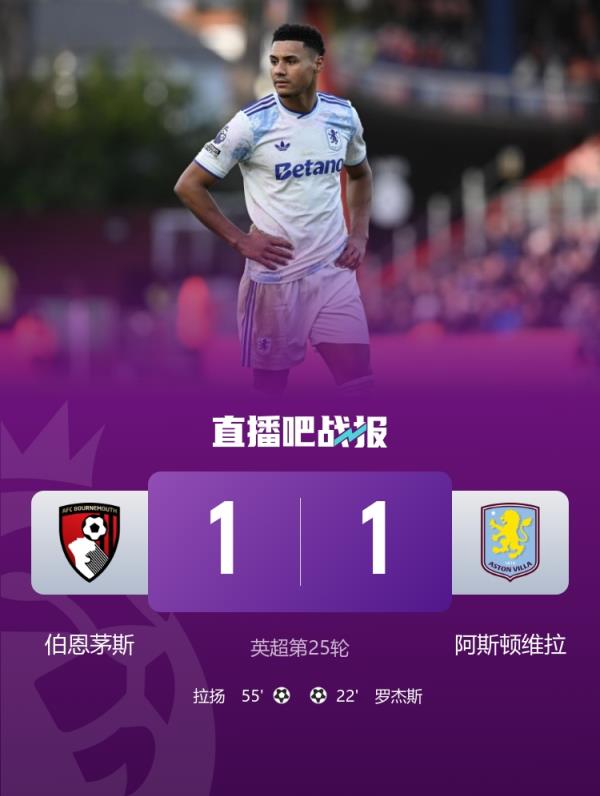 维拉客场1-1战平伯恩茅斯,遭遇两轮不胜。维拉近5场英超1胜2平2负,落后榜首阿森纳9分,只领先第四的曼联3分。