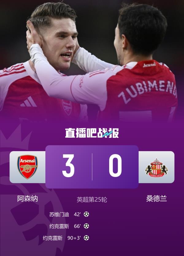先赛9分领跑!阿森纳3-0桑德兰 苏维门迪贴地斩约克雷斯近6场5球