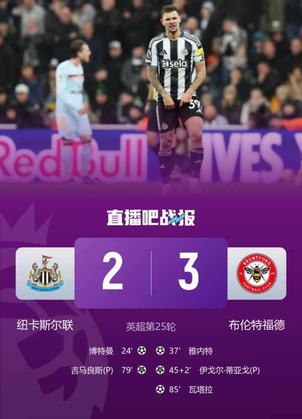 博特曼破门,墨菲手球送点,伊戈尔·蒂亚戈点射,吉马良斯造点+点射,瓦塔拉85分钟绝杀;纽卡各项赛事近9场仅1胜+3连败,英超暂列第12,布伦特福德升至第7。