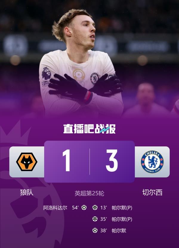 英超第25轮,切尔西客场挑战狼队,库库雷利亚助攻,帕尔默38分钟上演帽子戏法。