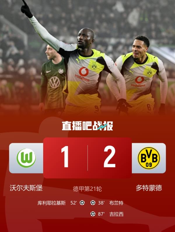 落后拜仁3分!多特2-1狼堡联赛5连胜 吉拉西绝杀阿穆拉5失良机