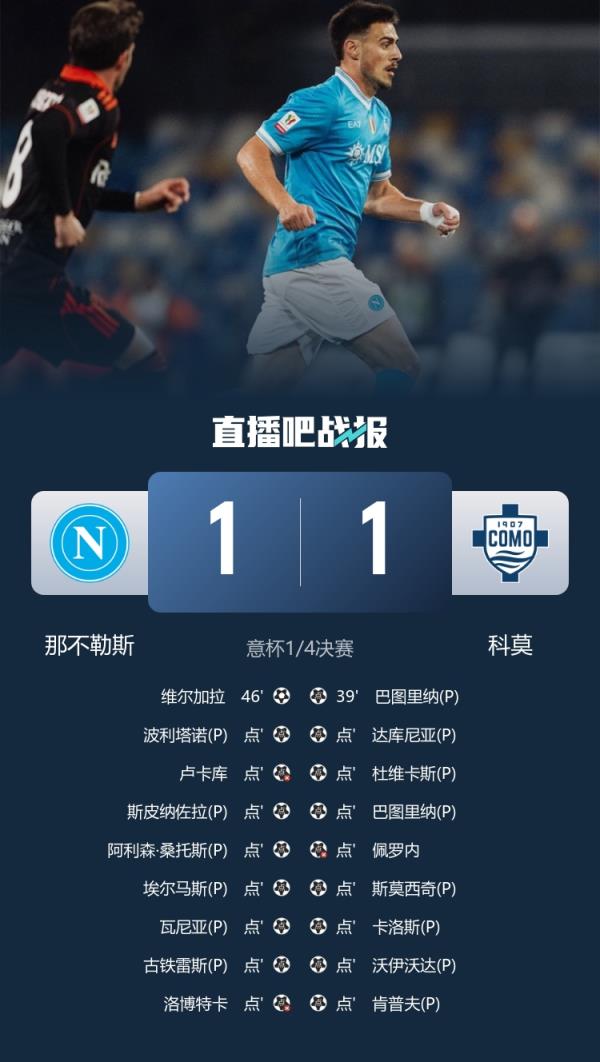 意杯1/4决赛,那不勒斯点球大战被科莫淘汰,卢卡库失点。