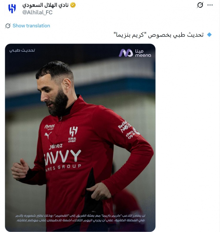 利雅得新月官方:本泽马感到内收肌疼痛,他将在周二接受检查